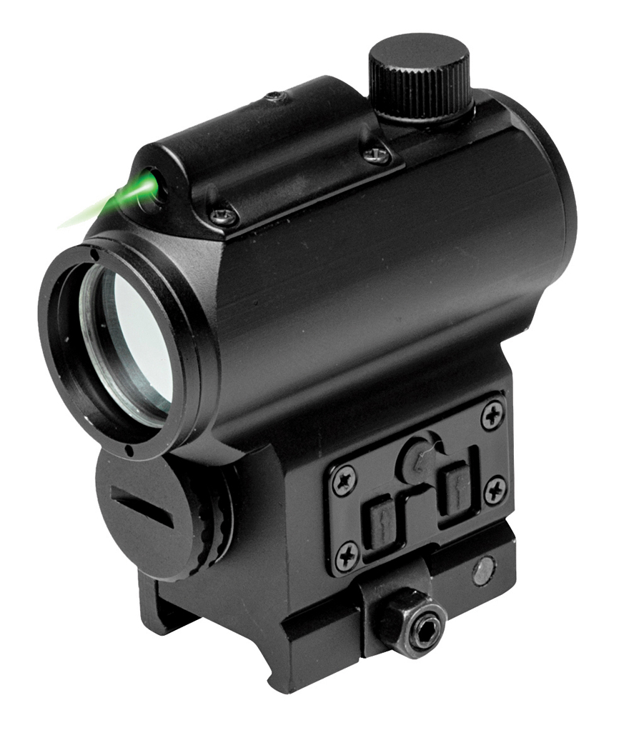 The VISM Reflex Sight with Green Laser (SRP: $119.99) is a compact sight system that combines a red reflex sight and a green laser. Both the dot sight and laser are controlled by a push-button control panel and powered by a single CR123A battery. The sight provides a 1/3 co-witness with BUIS. (ncstar.com)