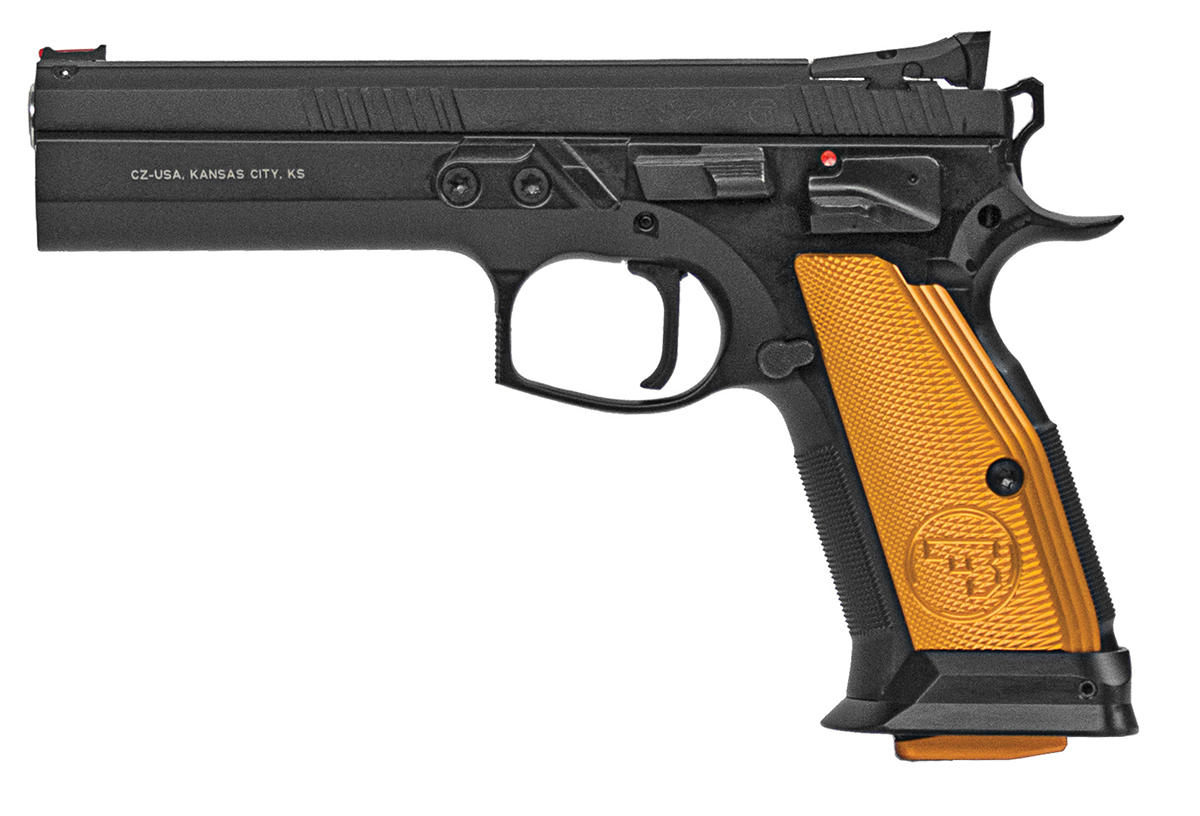 Turning the Tactical Sport up a notch, the CZ 75 Tactical Sport Orange borrows a number of design features from the Czechmate and incorporates a few of its own. With the slimmer trigger guard, revised grip geometry, and finer checkering from the Czechmate frame, it adds a thumb stop and fully adjustable target sights. With the same long slide and full-length dust cover as the standard TS, it also shares the single-action-only trigger, giving it an incredibly light pull and short reset. SRP: $1,784. (cz-usa.com)