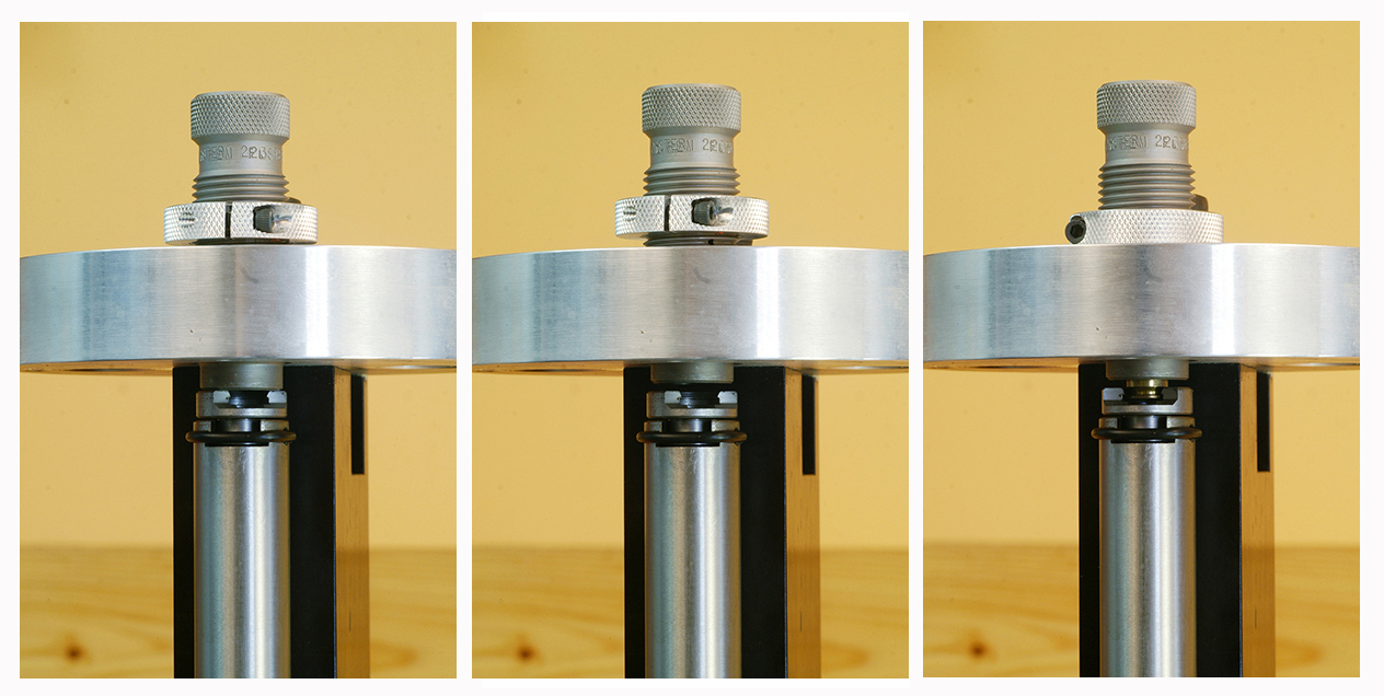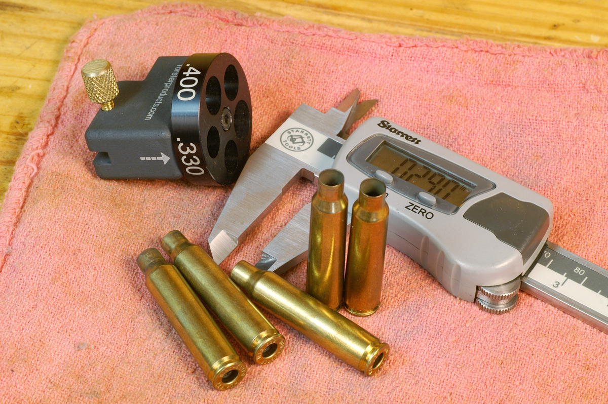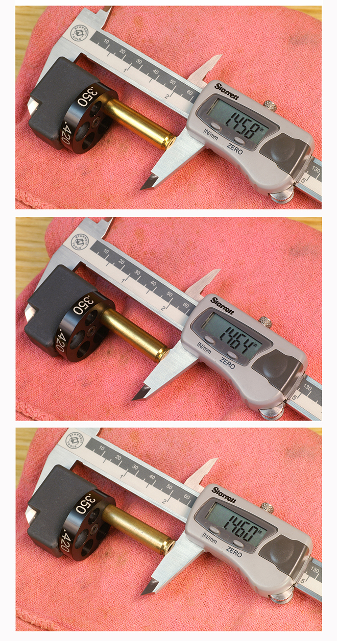 The numbers we need to get from our gage are these: new, unfired case shoulder height (where we started); fired, unsized case shoulder height (where we went to); sized case shoulder height (where we need to get back to).