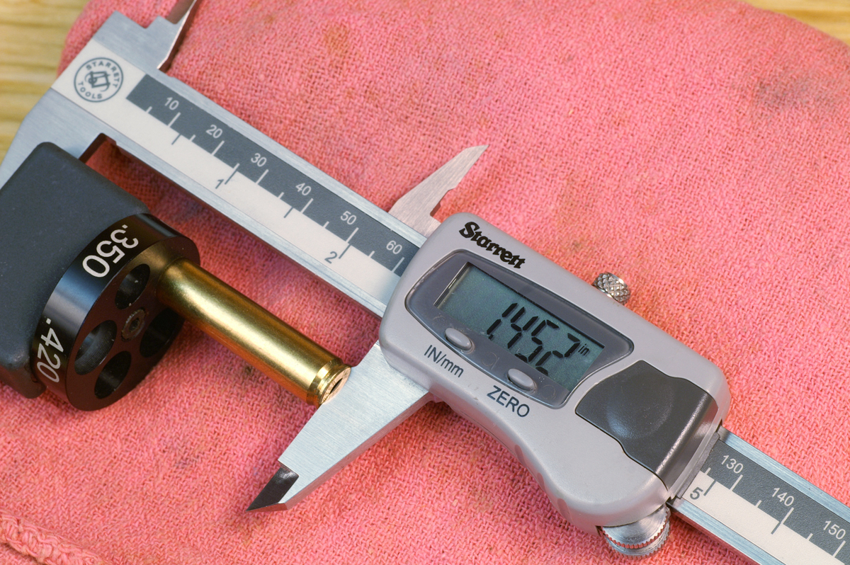 To correctly resize cases, we need a gage. Of course we do! I prefer the one shown in this article. It reads from case base to datum line, just as it’s done in chambering a barrel.