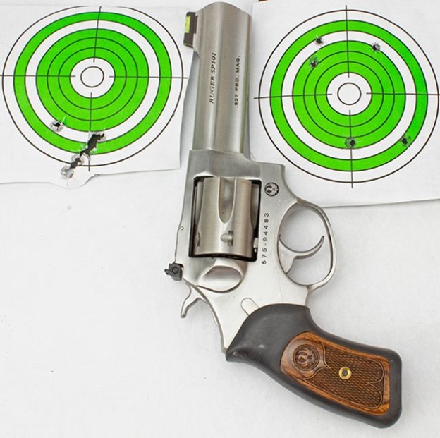 The left target was fired all single-action and the right one all double-action with the author’s .327 Federal Magnum SP101 offhand at 10 yards.