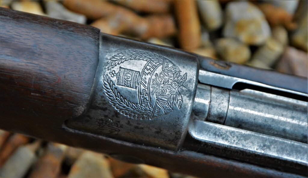 The Czech-made K98K is also a rare example. The rifle sent to me was a number matching example and used for RTI’s website stock photo. While it has no specific Ethiopian/Abyssinian Crest, it does feature the St. George Coin in the stock. On top of that, there is both a Czech proof stamp and Nazi eagle stamp on the barrel. The barrel bands and trigger guard are stamped; with the addition of the bolt takedown hole incorporated into the metal buttstock protector and dou-45 – Waffenwerke Bruenn AG, Werk Bystrica – and an early post-war example given the Nazi markings. This model is very similar to the Israeli K98 which was funneled through Ethiopia on its way to Israel. The bluing on this rifle is excellent. While both barrel bands and barrel have significant bluing wear, the receiver looks to have 90%. It’s worth noting, the front sight hood is still attached to this rifle. With a near-perfect bore and bluing wear in this pattern and no bolt pitting, it’s possible this was a lightly fired guard’s rifle and is a prime example.